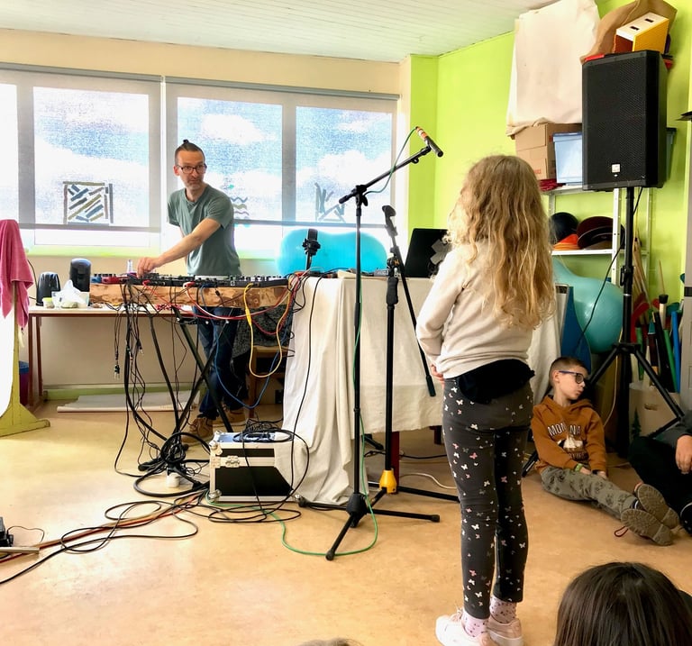 Quand une structure reçoit notre visite en atelier avant de nous accueillir en concert, certains enregistrements effectués lors de la médiation peuvent être utilisés lors du spectacle auxquels les enfants assistent.